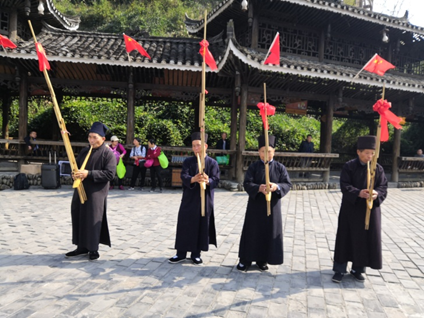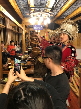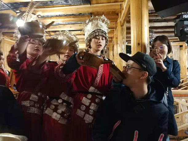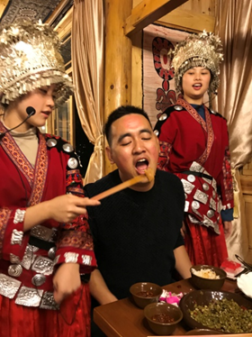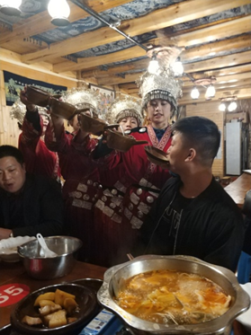 前往品嘗苗寨特色菜——長(zhǎng)桌宴,品嘗“高山流水”酒,“高山流水”酒是苗寨熱情的一種待客禮儀,就是一邊喝一邊倒。哈哈,考驗(yàn)?zāi)憔屏康臅r(shí)候來(lái)了!來(lái)看看珠高小伙們的“高山流水”,檢測(cè)室的蔡工因坐了寶位,更是得到菇?jīng)鰝兊拇骨啵茮](méi)喝完想吃肉可不行,揪住耳朵讓你吃不著,還得先把碗里的酒喝完。