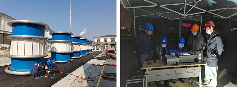 2020年11月20日珠高電氣檢測有限公司(以下簡稱:珠高檢測)在射陽海上南區(qū)H2#30萬千瓦風(fēng)電項目海底電纜交接試驗圓滿完成。本次海纜系統(tǒng):由127/220kV 3×500mm2海底光電復(fù)合纜三芯交聯(lián)聚乙烯絕緣電力電纜和2套GIS終端及2套中間接頭組成,全長70公里,是目前國內(nèi)最長的220kV海纜系統(tǒng),試驗內(nèi)容包括:核相檢查,絕緣電阻測量,交流耐壓試驗,線路工頻參數(shù)測量;由于線路長容量大,本次交流耐壓試驗對設(shè)備的長期運(yùn)行和熱穩(wěn)定性是極大的考驗,此次設(shè)備是珠高檢測自有設(shè)備:XZF-520kV/78000kVA變頻串聯(lián)諧振試驗系統(tǒng),由2臺400kW變頻電源柜、2臺400kVA勵磁變壓器和6臺260kV/50A電抗器以及采集和控制系統(tǒng)組成。